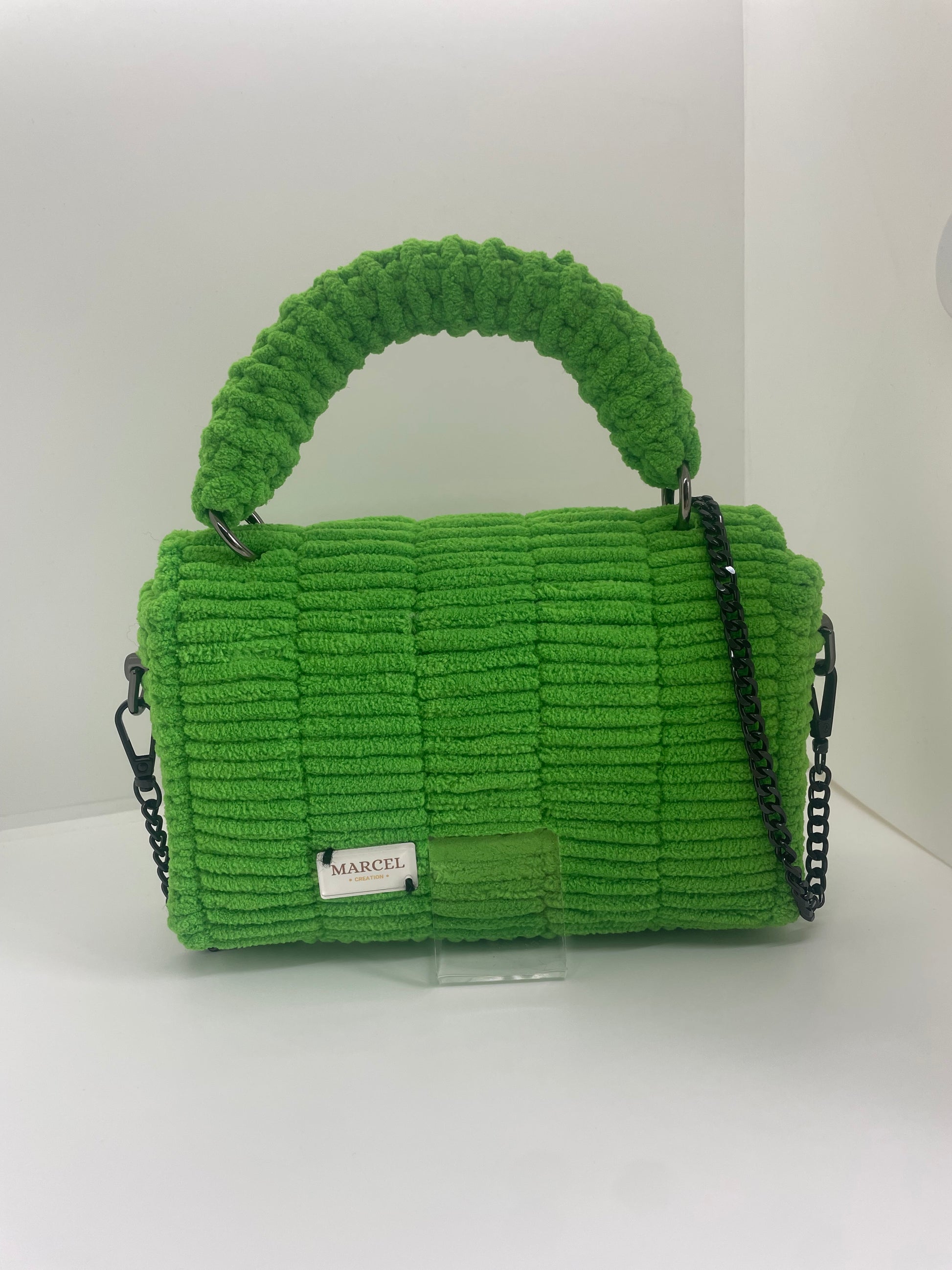 Sac conçu à la main en laine de chenille vert, au toucher doux et au style tendre. Fini avec une chaîne en acier inoxydable. Une pièce unique, pleine de fraîcheur, réalisée avec soin.